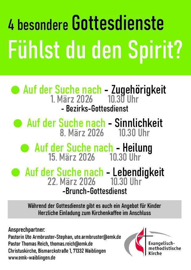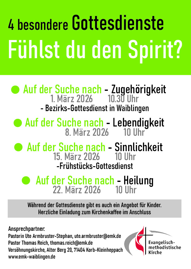 Wir starten mit einem Bezirksgottesdienst am 1. März in Waiblingen. Danach geht es in allen 3 Gemeinden weiter.